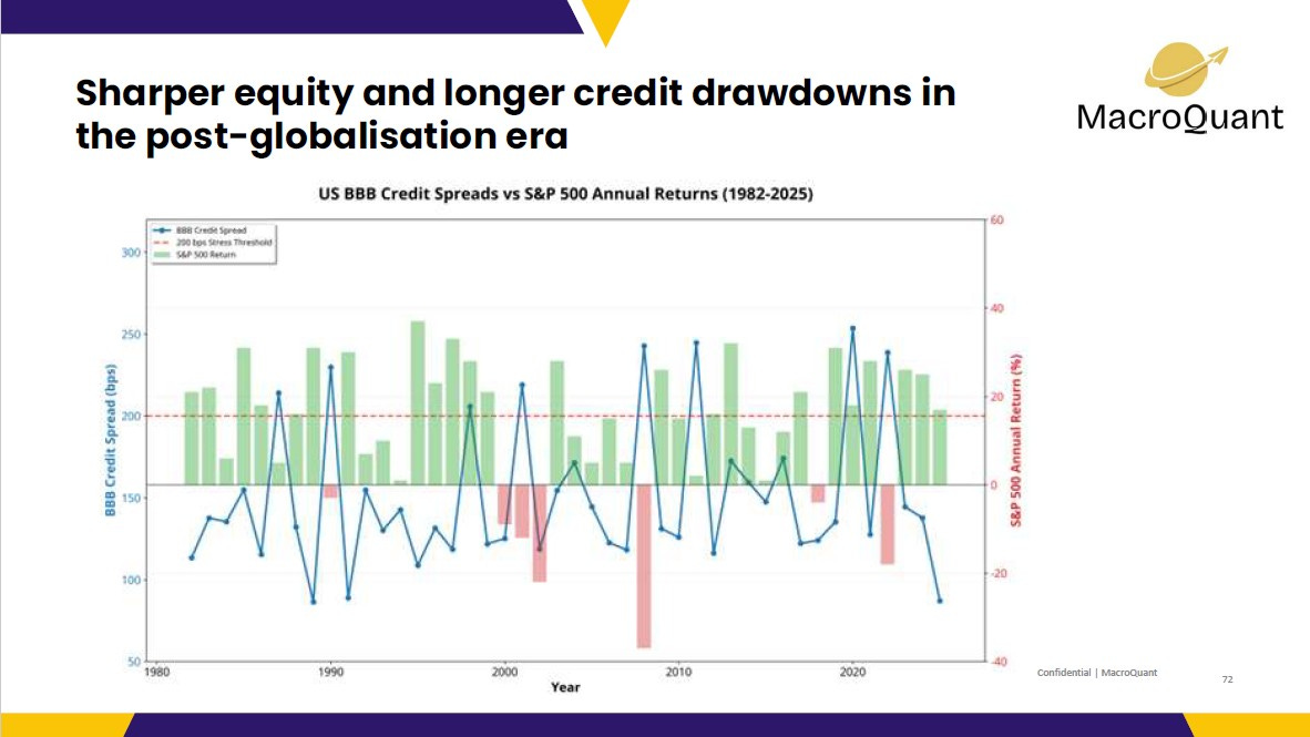 Despite this economic stability, financial market volatility has increased. A comparison of US equity drawdowns shows that while the frequency is only slightly higher post-1982, the average fall magnitude has deepened significantly. This decoupling is even more stark in the credit markets, where episodes of high credit stress have become more frequent and persistent. This paradox is attributed to the growing dominance of financial activity over the real economy, also known as financialisation.